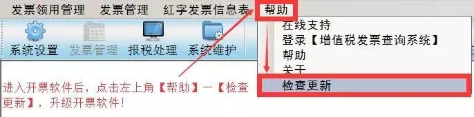 进入开票系统后,如果检查发现版本号非V2.3.10.200228版本,可点击“帮助”菜单中的“检查更新”手动触发升级。