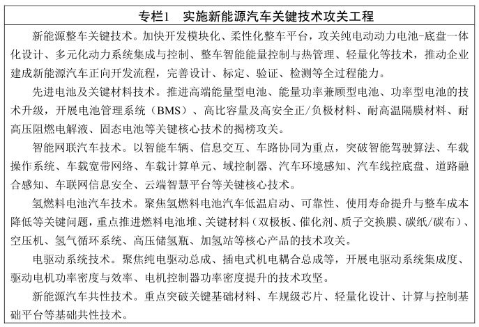 大力发展纯电动汽车、插电式混合动力(含增程式)汽车、燃料电池汽车等技术,强化整车集成技术创新,优化高性能整车模块化平台,完善热源安全智能管理技术,提高新能源整车综合可靠性。提升全气候、高安全、长续航动力电池系统,高功率、高密度电驱动系统,节能汽车动力耦合系统等核心技术水平。加强车用芯片、车载雷达、车载计算单元、车载操作系统、线控底盘、信息安全、感知雷达、边缘计算、测试工具等关键技术攻关。突破膜电极(质子交换膜、碳纸/碳布、催化剂)、氢气循环系统等技术,提升氢燃料电池系统、双极板、空气压缩机、高压储氢瓶、加氢装置等技术水平。引导开展关键基础技术、先进基础工艺、关键基础材料等共性技术的联合研发。