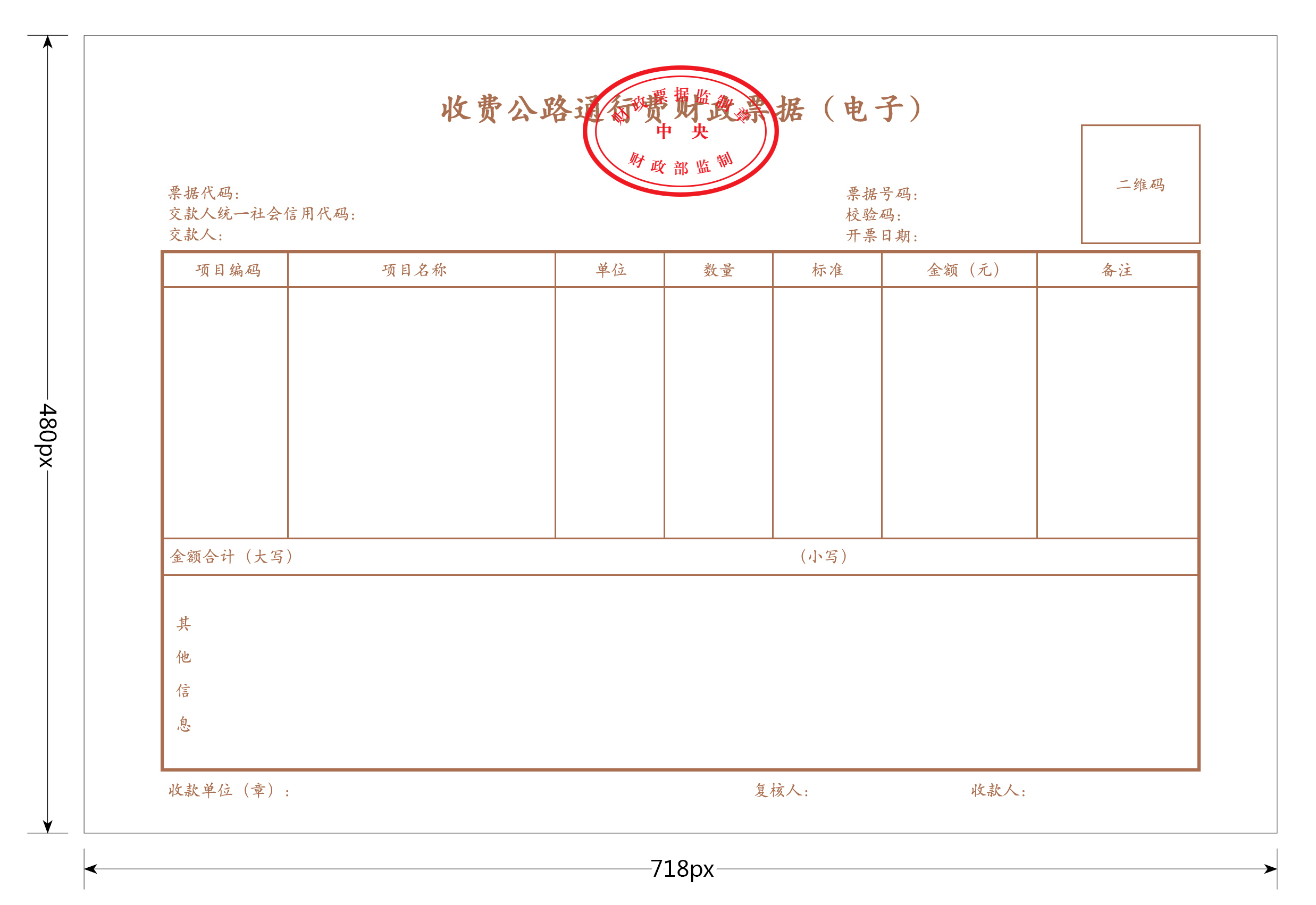 通行费财政电子票据的票据代码为8位,编码规则:第1~2位代表通行费财政电子票据监管机构行政区划编码,第3~4位代表通行费财政电子票据分类编码,第5~6位代表通行费财政电子票据种类编码,第7~8位代表通行费财政电子票据年度编码。票据号码为10位,采用顺序号,用于反映通行费财政电子票据赋码顺序。通行费财政电子票据票样见附件2。