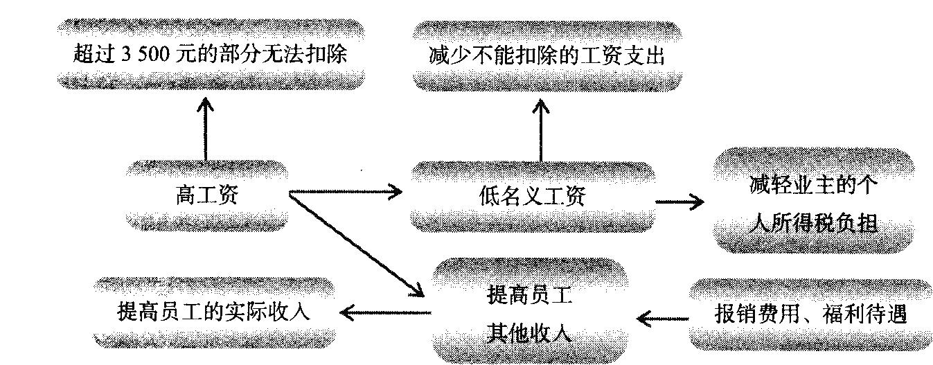 为了减轻企业员工和企业本身的税收负担,该公司可以通过降低名义工资的方式进行纳税筹划。将员工的工资降低到3500元/月,同时,每月为员工报销500元的票据,包括通信费、交通费、餐费、印刷费等,并将这些发票分别计入公司的各项费用支出之中。对于员工个人来讲,每月可以获得工资4000元,而且避免缴纳个人所得税,实际增加了员工的收入。假设员工报销的费用都可以进行税前扣除(由于各项费用支出具有一定的限额,因此可能会有一些费用无法全部扣除,但只要根据企业的实际生产经营情况进行调整,基本上都可以实际扣除),则该企业的应纳税所得额以及应纳税额仍然保持不变。