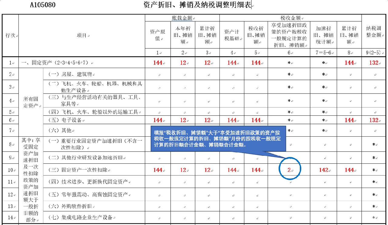 需要注意的是,在填报上表时不要忘记第10行数据的填报。其中第10行第6列“享受加速折旧政策的资产按税收一般规定计算的折旧、摊销额”,是指该加速折旧资产在不享受加速折旧、摊销优惠政策情况下,按照税收规定的最低折旧年限以直线法计算的折旧额、摊销额。本列仅填报“税收折旧、摊销额”大于“享受加速折旧政策的资产按税收一般规定计算的折旧、摊销额”月份的按税收一般规定计算的折旧额合计金额、摊销额合计金额。