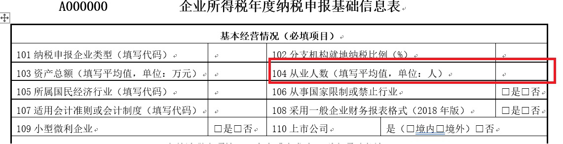 企业所得税汇算清缴时,A000000《企业所得税年度纳税申报基础信息表》中的“基本经营情况”为纳税人必填内容。今天着重给大家解读一下该部分中的“104从业人数”栏次的填报。该栏次数据直接关系到企业能否满足小型微利企业的条件,可否享受企业所得税收优惠政策,因此在填报时必须要注意。