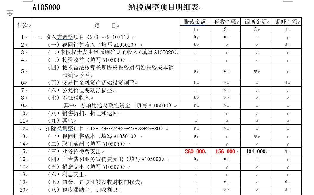 2.上述栏次填报完成后,第3列“调增金额”自动生成10.4万元。即甲公司2018年度业务招待费支出实际发生26万元,可税前扣除的金额为15.6万元,应做纳税调增26-15.6=10.4万元。