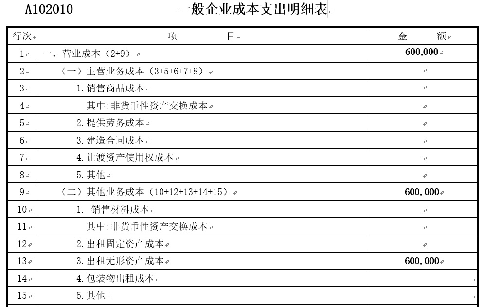 9 | (二)其他业务成本(10+12+13+14+15) | 100000 |