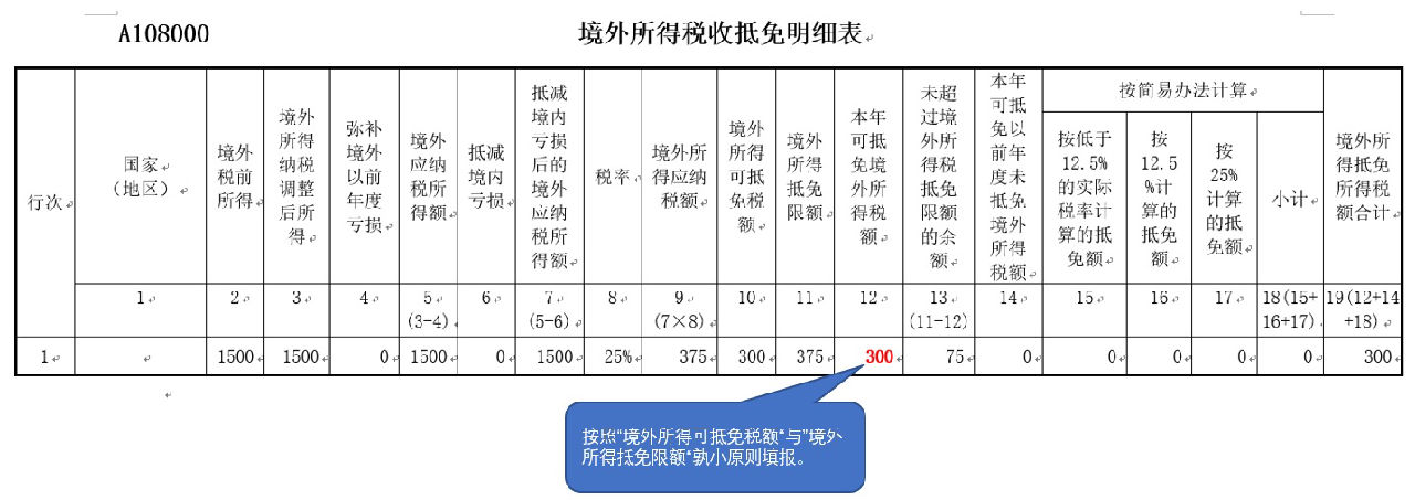 经过上述分析,A公司采用“不分国不分项”的抵免方式,则《A108000境外所得税收抵免明细表》填报如下图所示: