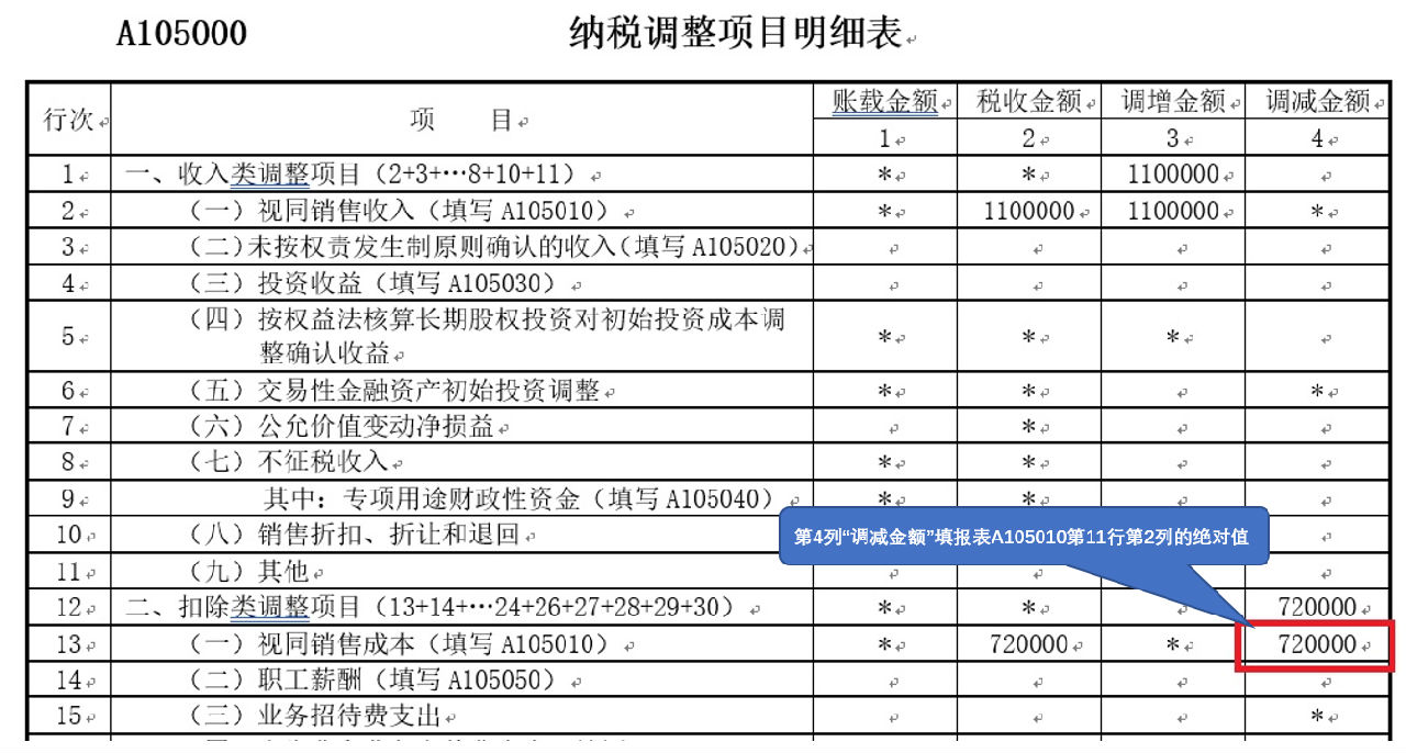 需要注意的是:根据填表说明,该表第12-20行的各项目销售成本,填报会计处理不确认销售收入,税收规定确认为应税收入对应的视同销售成本金额。对应的第1列“税收金额”填报予以税前扣除的视同销售成本金额;将第1列税收金额以负数形式填报第2列“纳税调整金额”。