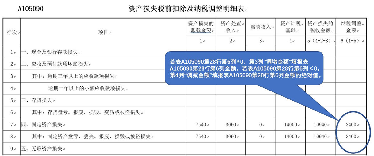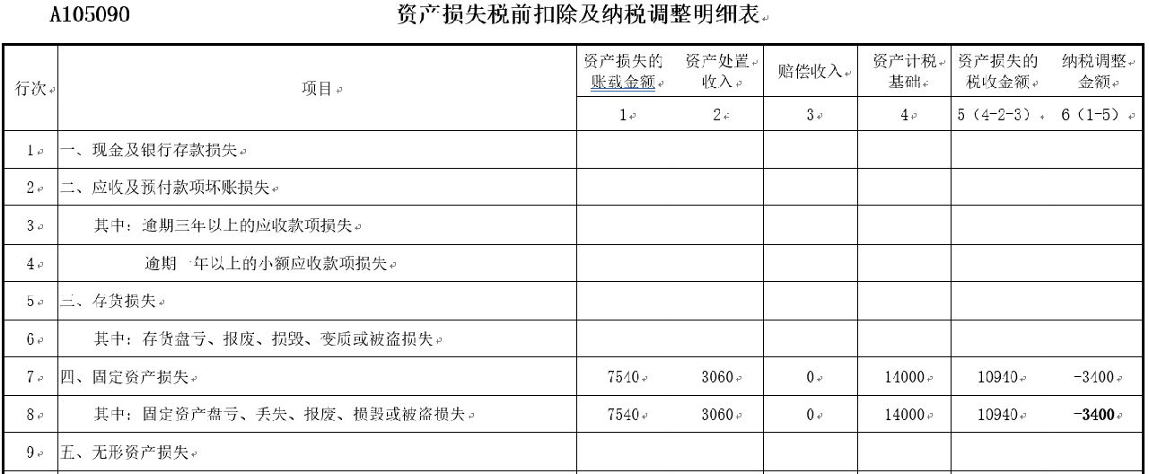 在进行2018年度企业所得税汇算清缴时,会计上确认的固定资产报废损失为7540元,税法上计算的固定资产报废损失=6060-(234000-220000)-3000=-10940元。应进行纳税调减=10940-7540=3400元。2018年企业所得税年度纳税申报填写如下所示: