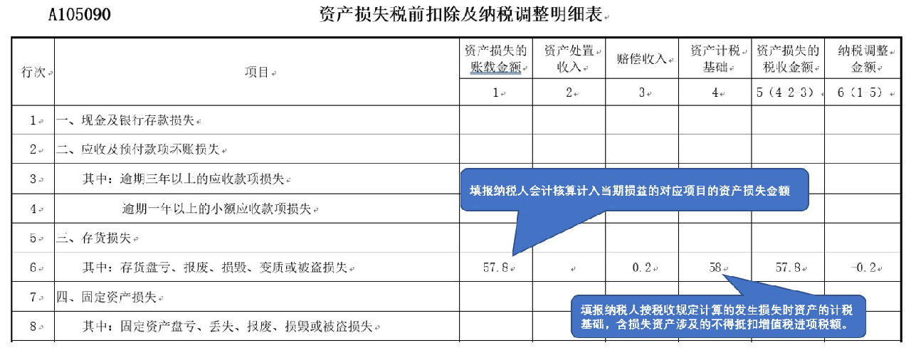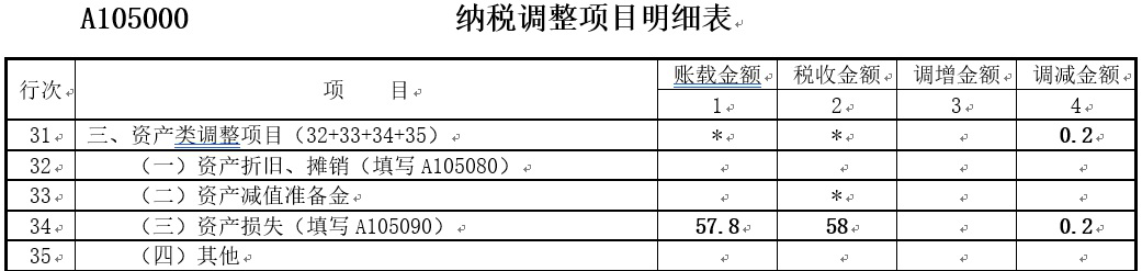 项目 | 资产损失的账载金额 | 资产处置收入 | 赔偿 收入 | 资产计税基础 | 资产损失的税收金额 | 纳税调整金额 |