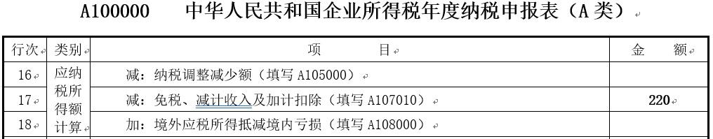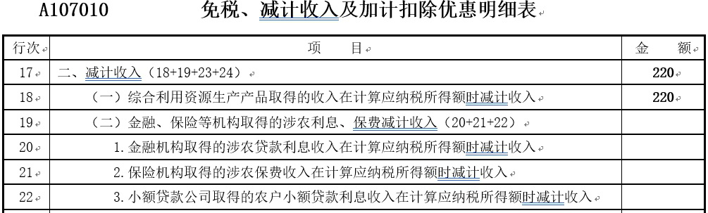 2018年度综合利用资源生产收入为2200万元,在计算应纳税所得额时减计收入=2200×10%=220万元。企业所得税年度纳税申报相关报表填报如下: