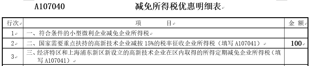 2 | 二、国家需要重点扶持的高新技术企业减按15%的税率征收企业所得税(填写A107041) | 140 |