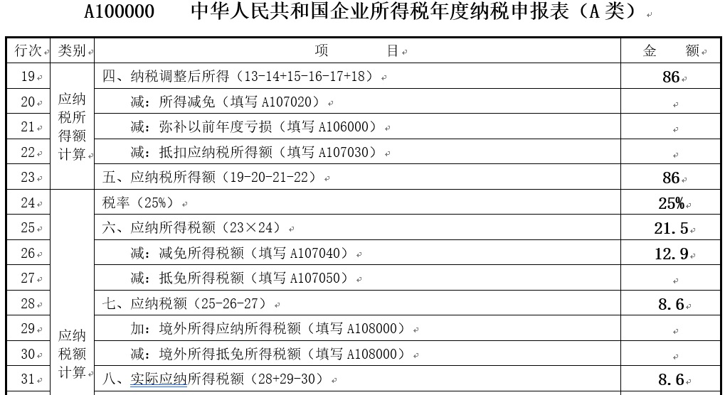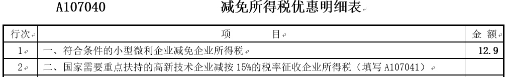 2018年可享受企业所得税减免税优惠=86×15%=12.9万元。对于减免的企业所得税,应填报在《A107040 减免所得税优惠明细表》第1行“一、符合条件的小型微利企业减免所得税”栏次。相关报表填报如下(单位:万元):