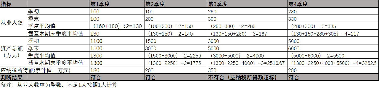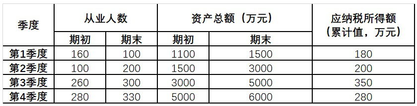 示例:假定A企业2019年1月成立,从事国家非限制和禁止行业,2019年各季度的资产总额、从业人数以及累计应纳税所得额情况如下: