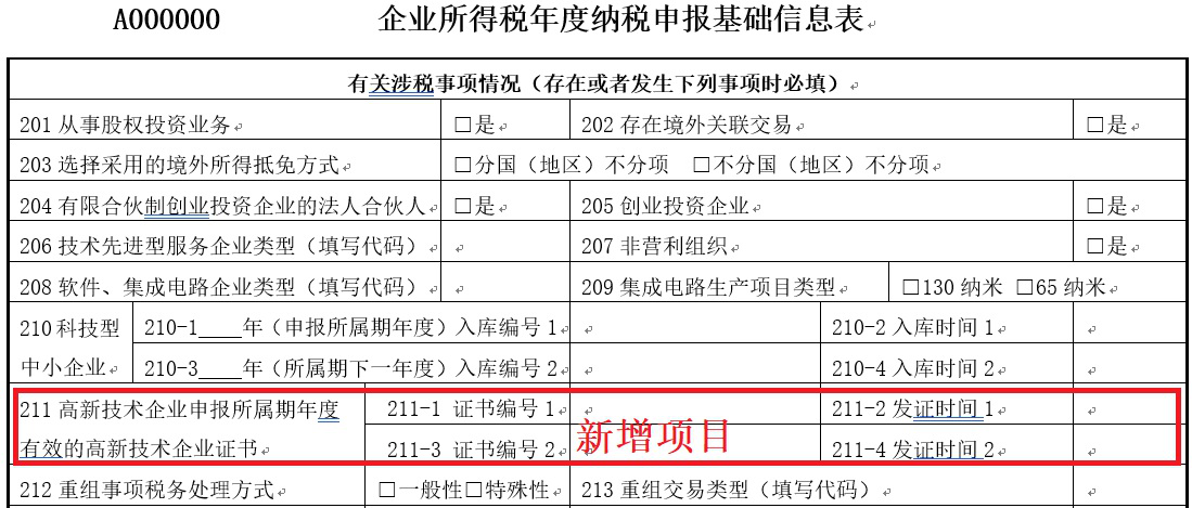 2018年《A000000企业所得税年度纳税申报基础信息表》新增了“211高新技术企业申报所属期年度有效的高新技术企业证书”填报模块。请大家通过以下案例来了解如何正确填报该项目。