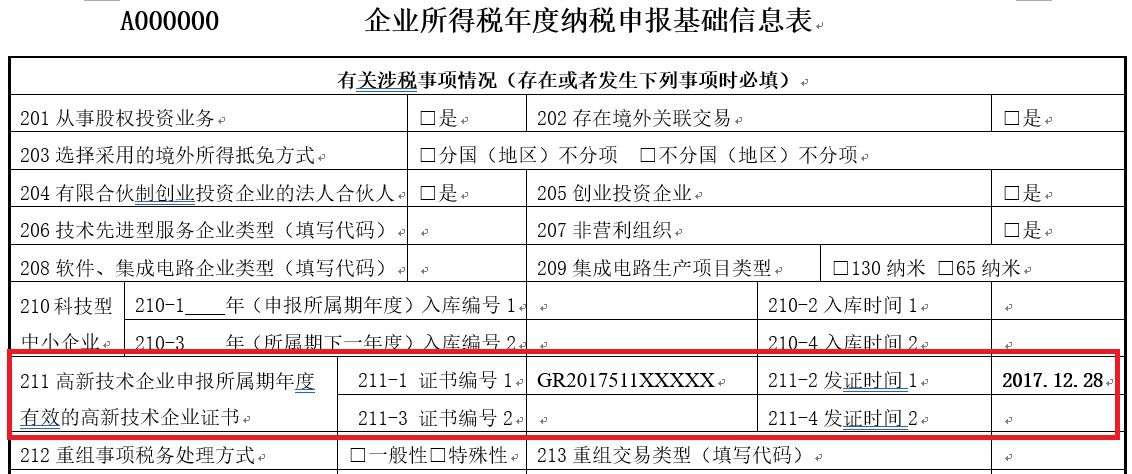 【案例1】甲网络科技有限公司2017年12月28日取得高新技术企业证书,证书编号GR2017511XXXXX,有效期3年。请问:2018年企业所得税年度申报,《A000000企业所得税年度纳税申报基础信息表》应如何填报?