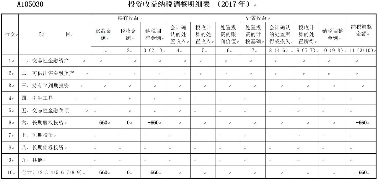 账载 金额 | 税收 金额 | 纳税调整金额 | 会计确认的处置收入 | 税收计算的处置收入 | 处置投资的账面价值 | 处置投资的计税基础 | 会计确认的处置所得或损失 | 税收计算的处置所得 | 纳税调整金额 | |||