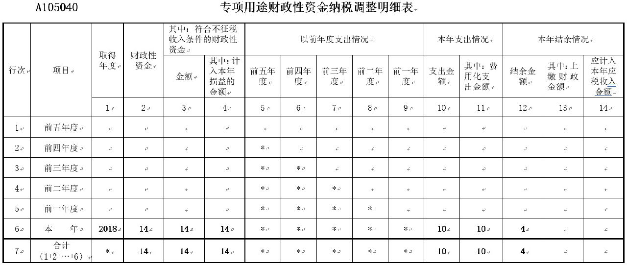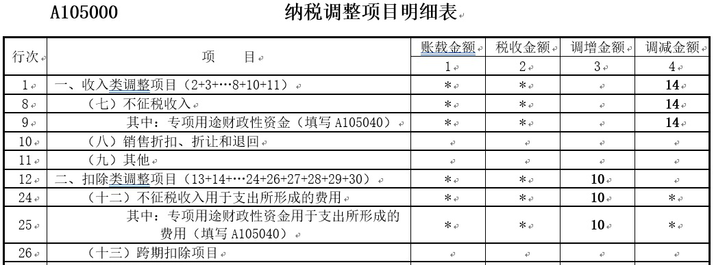 假设甲软件公司将取得的即征即退增值税款14万元,当年专项用于软件产品研发的支出为10万元(全部费用化),会计上对该资金进行了单独进行核算,符合税法上不征税收入确认条件。则2018年企业所得税汇算清缴时相关报表填报如下: