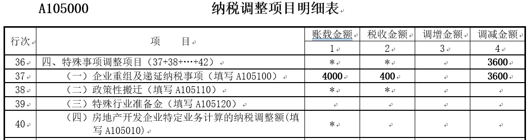 在税法上,A公司非股权支付对应的资产转让所得或损失=(被转让资产的公允价值-被转让资产的计税基础)×(非股权支付金额÷被转让资产的公允价值)=(12000-8000)×(1200÷12000)=400万元。在会计上,A公司确认了股权转让收益4000万元。因此,应调减应纳税所得额4000-400=3600万元。