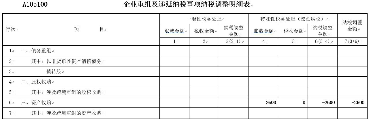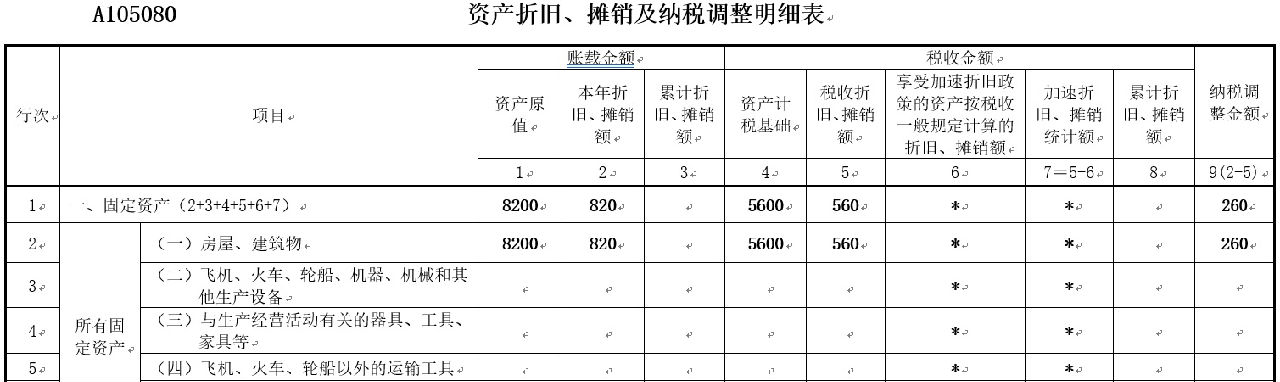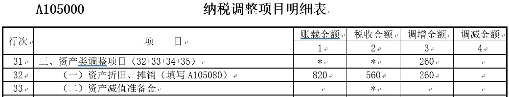 假定相关资产均为建筑物,完成收购后,当年甲信息公司对该收购资产会计上按照公允价值计提的折旧为820万元,税法上按计税基础计提的折旧为560万元。则当年应调增应纳税所得额=820-560=260万元,相关报表应填报如下: