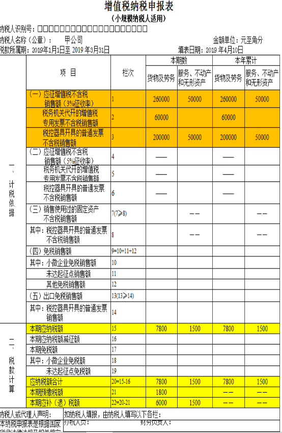 【案例一】甲公司是一家销售铝合金门窗同时提供上门安装服务的小规模企业,2019年1-3月销售门窗取得收入10万元,提供安装服务取得收入5万元,销售使用过的固定资产取得收入3万元,通过税控系统自开增值税普通发票(以上收入均为不含税收入)。