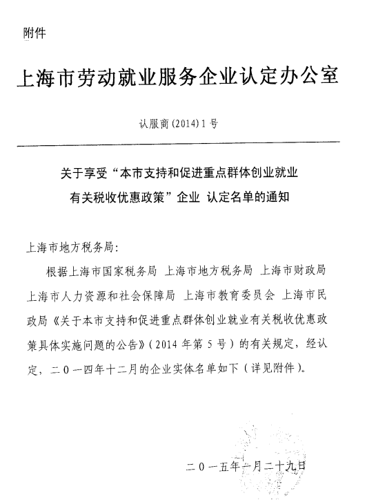 现将上海市人力资源和社会保障局有关本市支持和促进重点群体创业就业有关税收优惠政策企业2014年12月吸纳符合条件人员的认定名单下发给你们,请按照《上海市国家税务局 上海市地方税务局 上海市财政局 上海市人力资源和社会保障局 上海市教育委员会 上海市民政局关于本市支持和促进重点群体创业就业有关税收优惠政策具体实施问题的公告》(上海市国家税务局公告2014年第5号)的规定执行,执行中有何问题,请及时与市局联系。