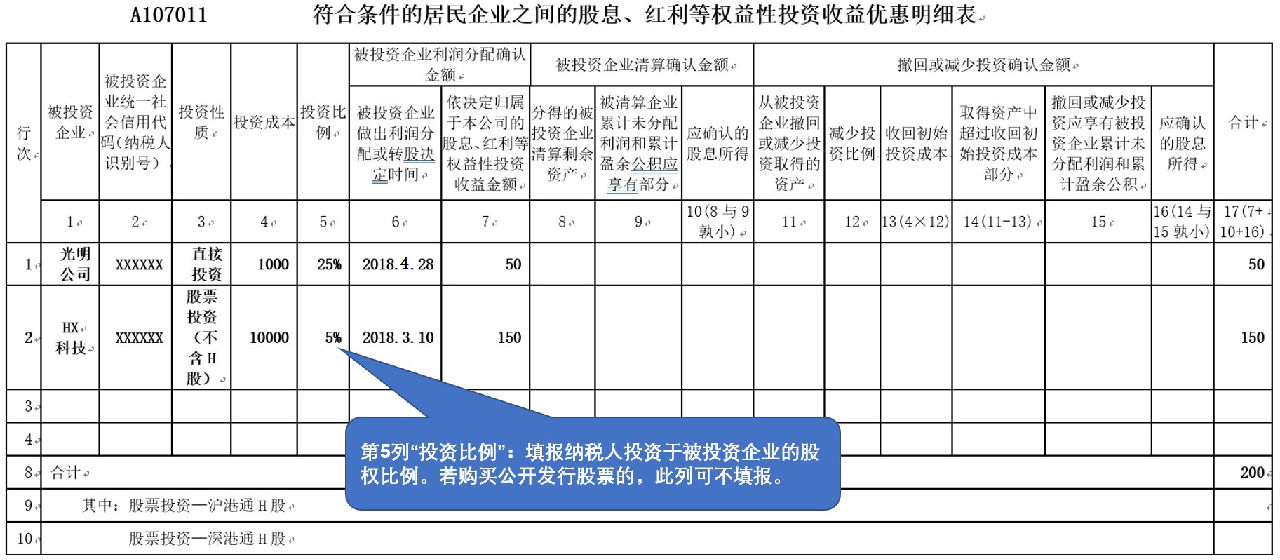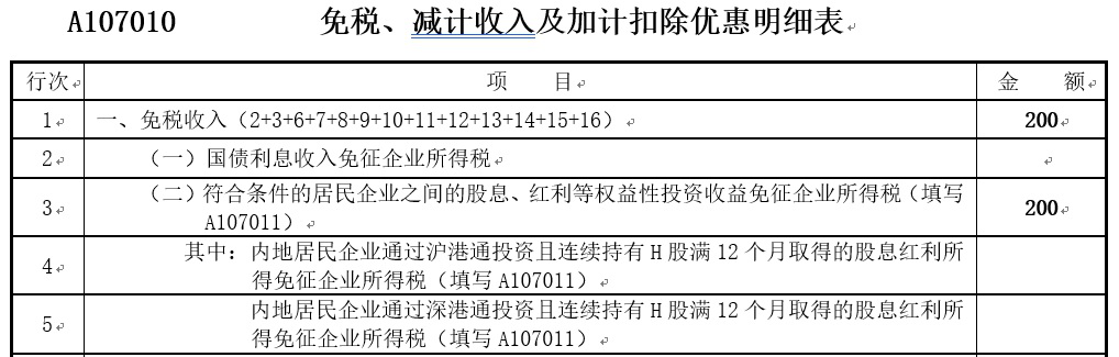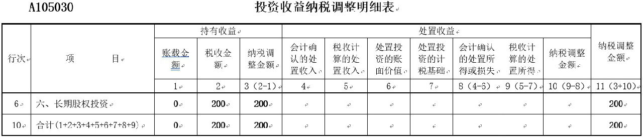 2018年会计上未确认投资收益,而税收上确认了投资收益200万元,应调增应纳税税所得额200万元(2017年账上确认投资收益时已通过105030纳税调减)。当年企业所得税汇算清缴时,相关报表填报如下: