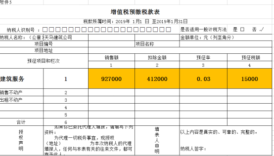 5.若该纳税人可自行开具增值税专用发票纳税人,填报方法和税务机关代开专用发票一致,代开销售额填报在应填入第2栏“服务、不动产无形资产”列,但无预缴税款。
