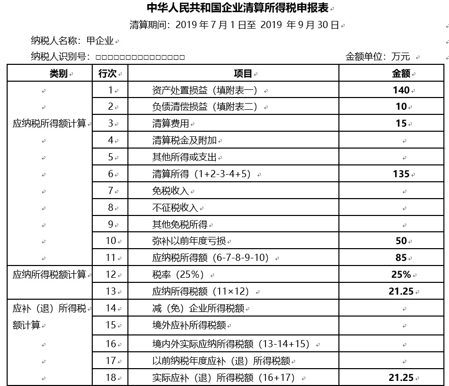 2019年9月,甲公司清算结束,办理相关注销手续。假定不考虑除企业所得税之外的其他税费,请问甲公司应如何进行税务处理?