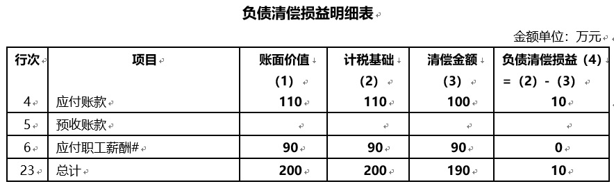 在清算所得纳税申报时,首先填报资产处置损益明细表、负债清偿损益明细表、剩余财产计算和分配明细表;最后填报中华人民共和国企业清算所得税申报表。根据上述计算,相关报表应填报如下: