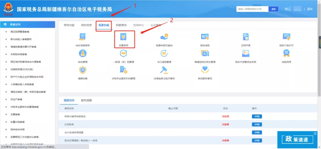 2.进入首页后点击我要办税(1),选择发票使用(2)