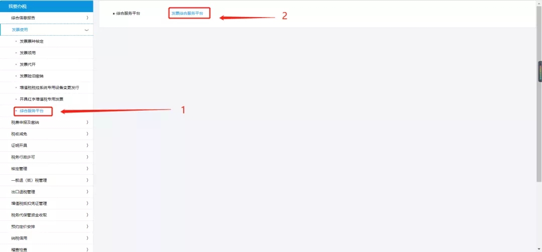 3.进入发票使用页面点击左侧综合服务平台(1),选择发票综合服务平台(2)
