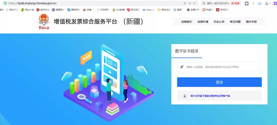 2.已安装相关控件的用户:在电脑上连接好金税盘或税控盘,在浏览器输入新地址https://fpdk.xinjiang.chinatax.gov.cn/。输入证书密码即可。