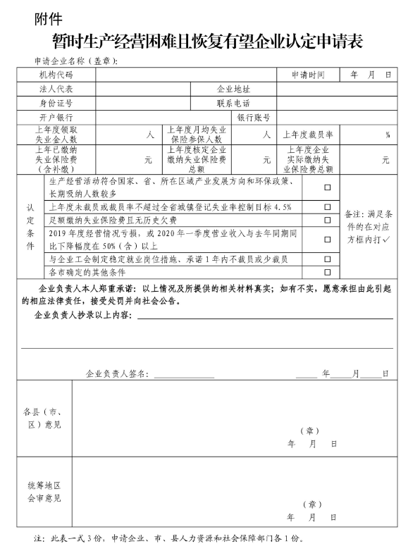 为认真贯彻落实党中央、国务院和省委、省政府关于就业工作安排部署,充分发挥失业保险保生活、防失业、促就业功能作用,全力做好保就业工作,结合我省实际,现就做好暂时生产经菅困难且恢复有望企业(以下简称困难企业)认定事宜通知如下: