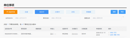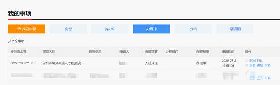 办理中:业务已提交,业务信息不可编辑,可查看业务办理进度;