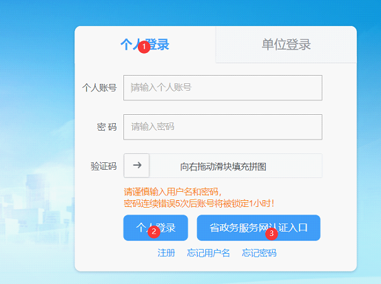 如果已经注册的用户为深圳人社局社会统一用户,则可以直接输入账号和密码登录,如果是广东省统一用户,则点击【省政务服务网认证入口】,系统跳转到省登录入口登录后跳转到深圳市人才一体化系统。 个人登录