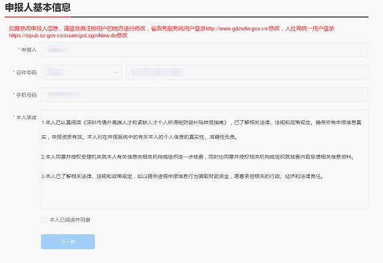 3. 了解业务相关信息后,需要认真阅读承诺内容,并勾选“本人已阅读并同意”申报承诺,单击【下一步】进行申报。