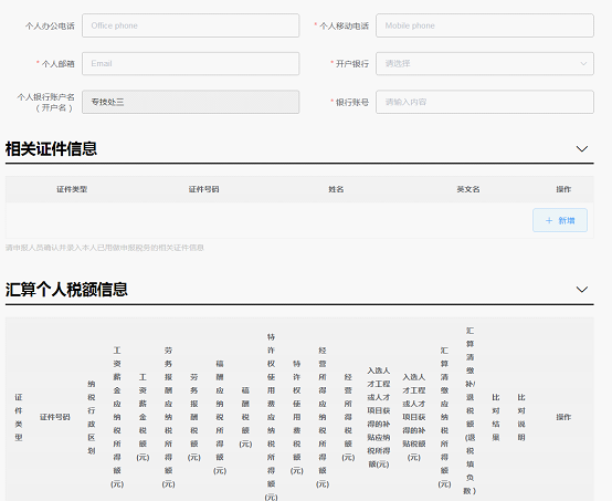 1.【申报个人信息、相关证件信息、汇算个人税额信息】等表单信息填写。