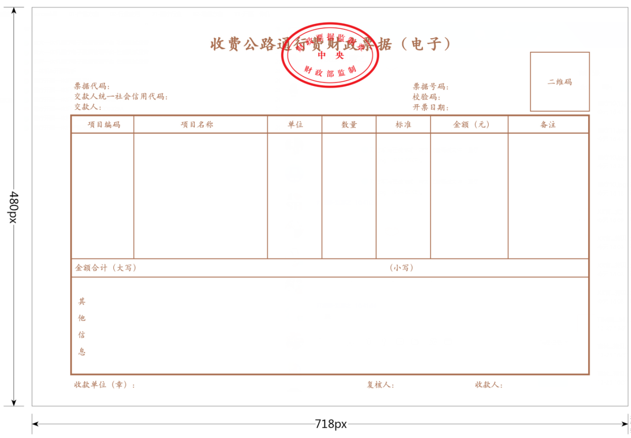 1.票面要素。包括:财政票据名称、财政票据监制章、票据代码、票据号码、交款人统一社会信用代码、交款人(单位或个人)、校验码、开票日期、二维码、项目名称、金额(元)、金额合计(大写)/(小写)、备注、其他信息、收款单位(章)、复核人、收款人等。