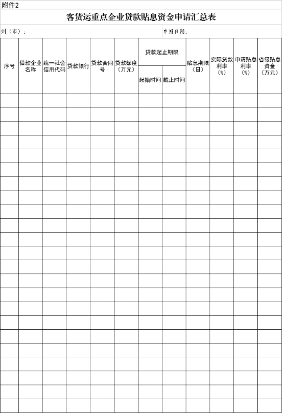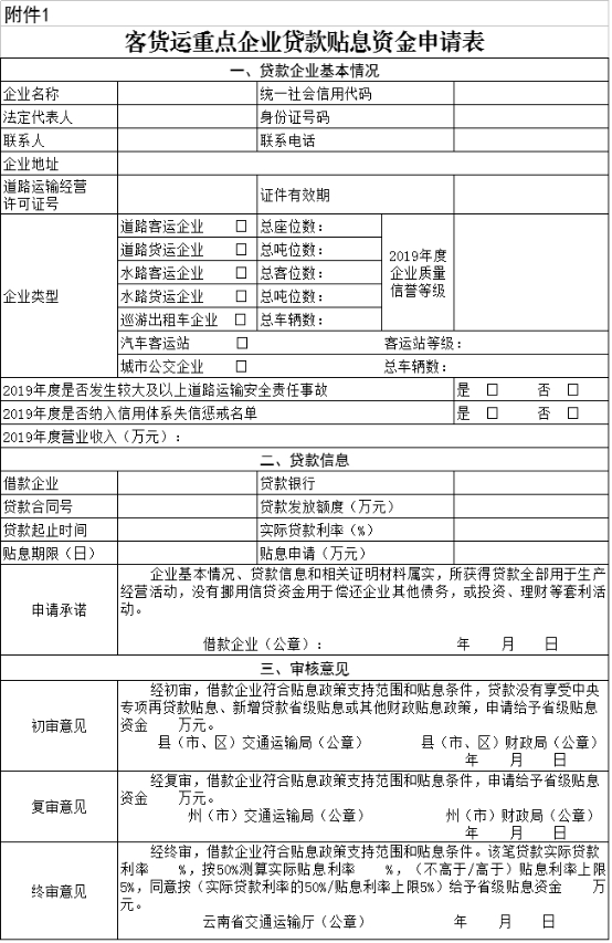1.贴息资金申报。纳入名单的借款企业填报《客货运重点企业贷款贴息资金申请表》(附件1),分别于2020年5月31日、2020年9月30日、2021年1月31日前分三批向企业注册地县(市、区)交通运输局申请贴息资金,上一批次已经申报过的贷款不得重复申报。县(市、区)交通运输局及时会同县(市、区)财政局严格审核、精准认定,经审核确认后填报《客货运重点企业贷款贴息资金申请汇总表》(附件2),分别于2020年6月10日、2020年10月10日、2021年2月10日前报送州(市)交通运输局、州(市)财政局。申请材料包括:县(市、区)申请文件、贴息资金申请表、贴息资金申请汇总表、借款企业2020年1月1日至2020年12月31日新生效贷款合同、贷款发放凭证、还贷相关信息以及其他与开展生产经营活动直接相关的证明材料。