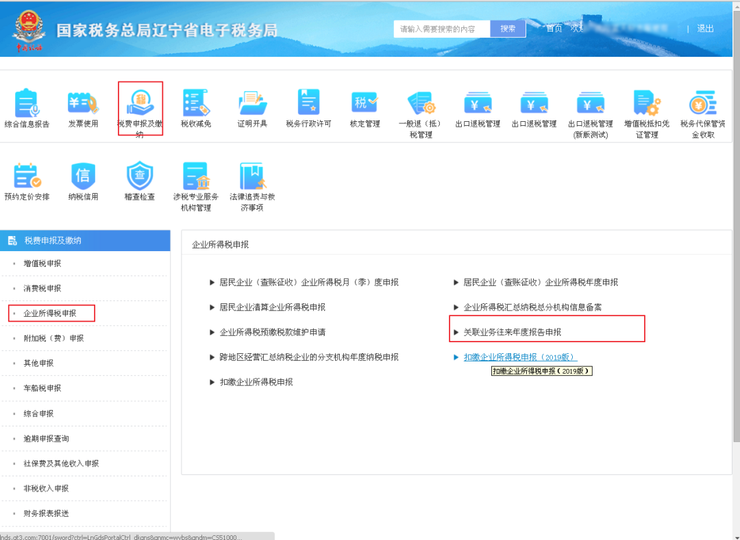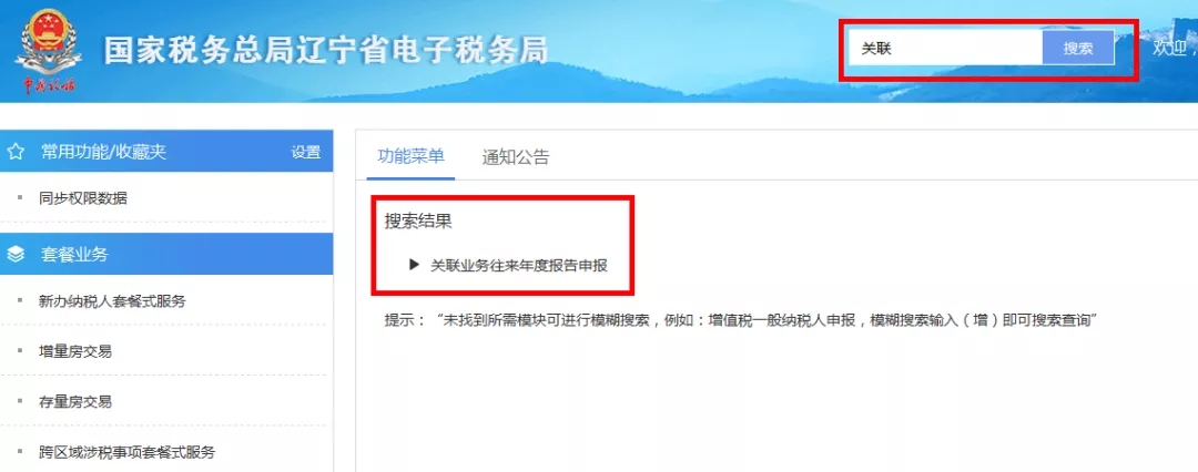 (二)点击【我要办税】-【税费申报及缴纳】-【企业所得税】-【关联业务往来年度报告申报】,进入该功能。或在搜索栏输入关键字,进行模糊查询。