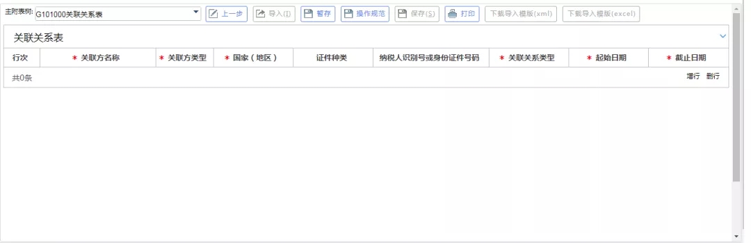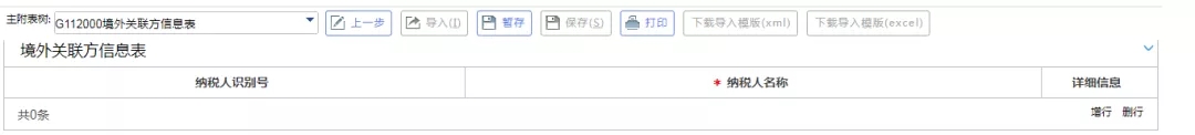 进入表操作页面,录入境外关联方详细信息,如果有多个境外关联方,点击【增行】按钮。