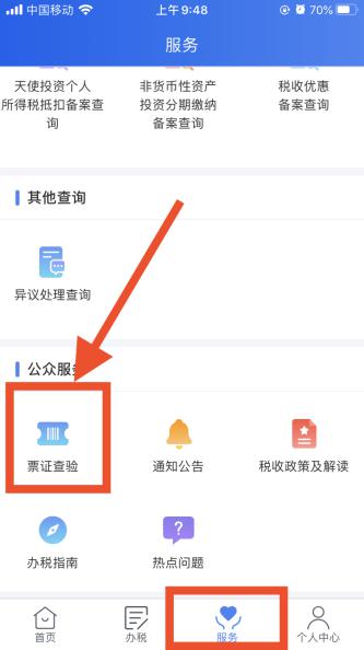 如纳税人需对个人所得税纳税记录真实性进行验证,可在手机上登录个人所得税APP,通过【服务】—【公众服务】使用【票证查验】功能进行验证。
