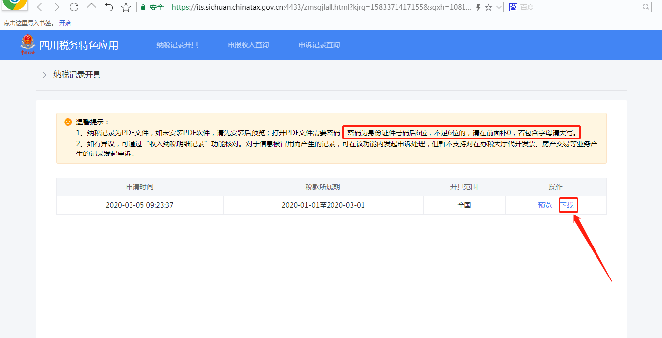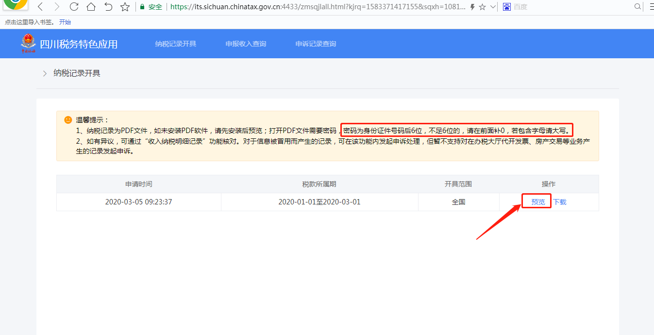 点击预览后,将会跳转至浏览器预览纳税记录界面。输入密码,可查看纳税记录。