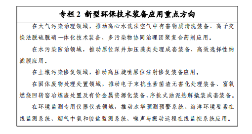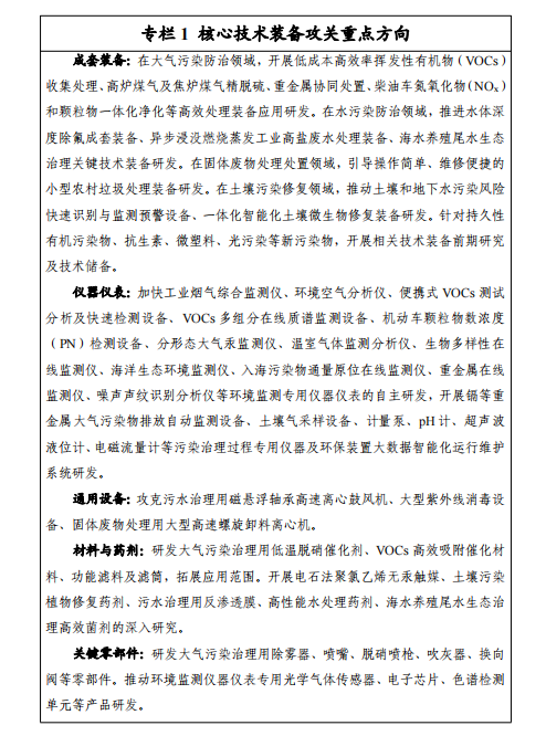 (三)加强关键核心技术攻关。聚焦“十四五”期间环境治理新需求,围绕减污降碳协同增效、细颗粒物(PM2.5)和臭氧协同控制、非电行业多污染物处置、海洋污染治理、有毒有害污染物识别和检测以及生态环境应急等领域,开展重大技术装备联合攻关。聚焦长期存在的环境污染治理难点问题,攻克高盐有机废水深度处理、污泥等有机固废减量化资源化技术装备。聚焦基础零部件和材料药剂等卡脖子问题,加快环境污染治理专用的高性能风机、水泵、阀门、过滤材料、低频吸声隔声材料、绿色药剂以及环境监测专用模块、控制器、标准物质研发。聚焦新污染物治理、监测、溯源等,抓紧部署前沿技术装备研究。