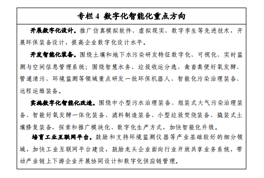 (十二)推动数字化智能化转型。深入推进5G、工业互联网、大数据、人工智能等新一代信息技术在环保装备设计制造、污染治理和环境监测等过程中的应用。加快污染物监测治理远程智能控制系统平台的开发应用,深入挖掘污染物远程监控数据,创造大数据价值,提升运维水平和治污效率,降低治理成本。完善环保装备数字化智能化标准体系,建设一批模块化污水处理装备等智能制造示范工厂,稳步提高大气治理、污水治理、固废处理等领域技术装备的数字化智能化水平。