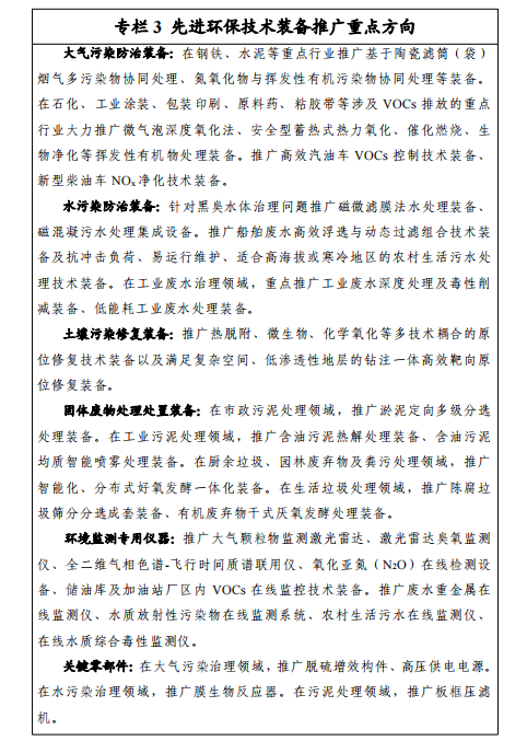 (七)加快先进装备推广。定期制修订《国家鼓励发展的重大环保技术装备目录》,编制供需对接指南,搭建装备制造企业与需求用户的有效对接平台。在大气治理领域,重点推广非电行业超低排放和挥发性有机物处理等先进技术装备,为PM2.5和臭氧协同治理提供支撑。在污水治理领域,重点推广黑臭水体治理、湖泊海洋治理、工业废水处理、农村小型分散式污水治理等先进技术装备,为水环境整体改善提升提供保障。在土壤污染修复领域,重点推广重金属、有机物等原位土壤污染修复装备,避免二次污染。在固体废物处理处置领域,重点推广无害化资源化利用技术装备。在环境监测仪器领域,重点提升高端环境监测仪器的自主创新供给能力。