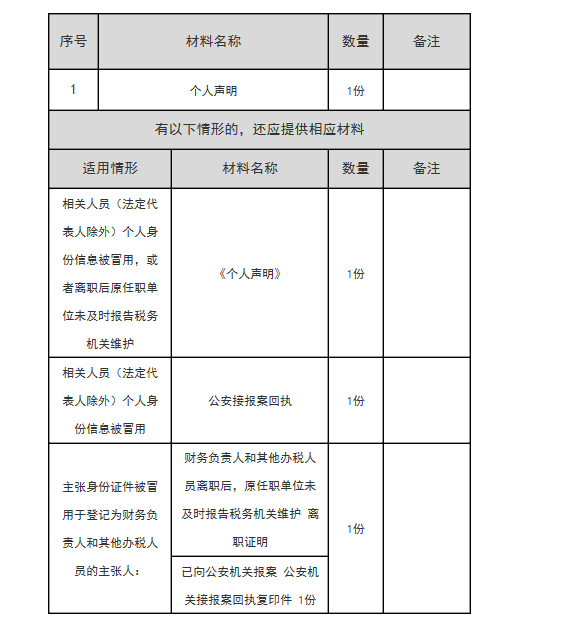 1.主张身份证件被冒用于登记为法定代表人、财务负责人和其他办税人员的: