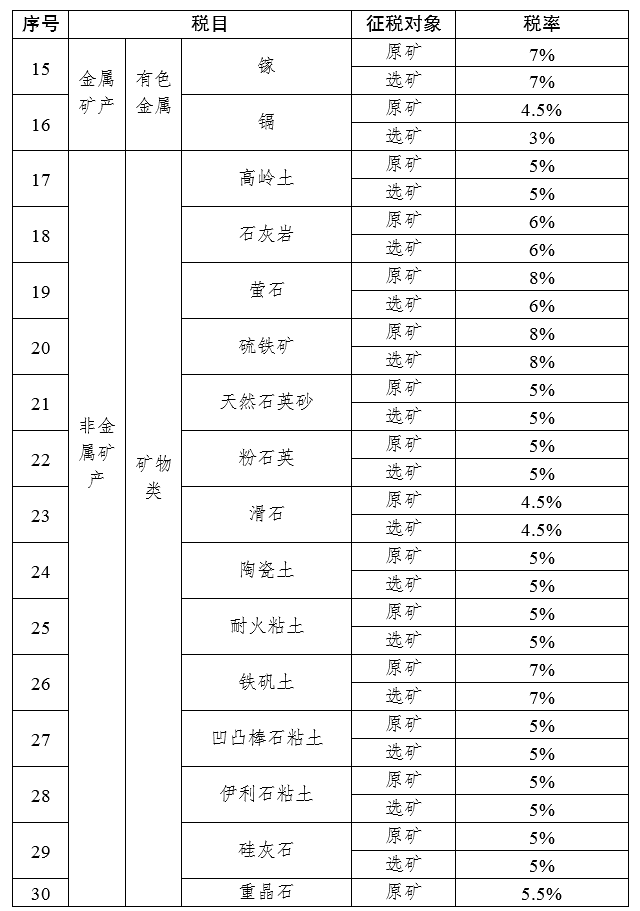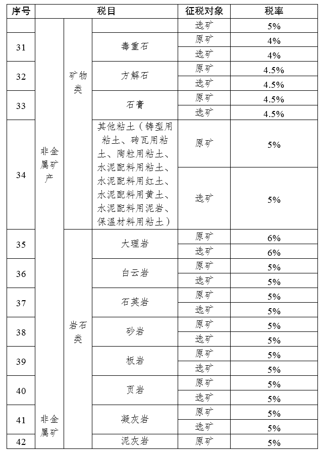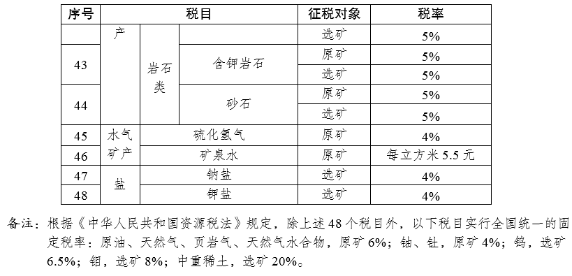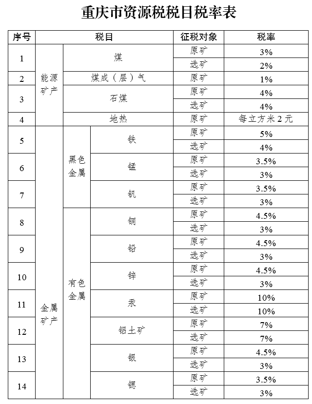 一、《资源税法》所附《资源税税目税率表》中规定实行幅度税率的资源税税目,其征税对象为原矿或者选矿的,具体适用税率按《重庆市资源税税目税率表》执行。