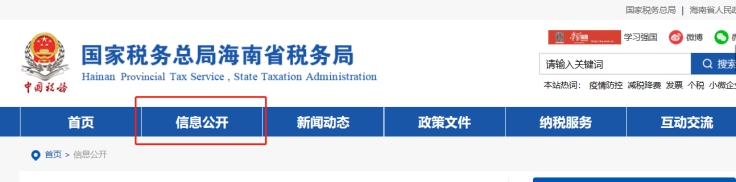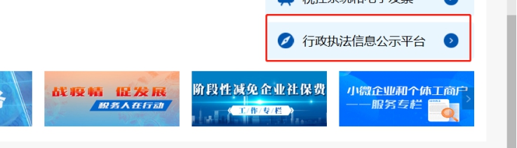 (二)登陆进入海南省税务局门户网站,在门户网站首页找到信息公开栏目下,如下图所示行政执法信息公示平台图标,点击即可进入公示平台。如下图: