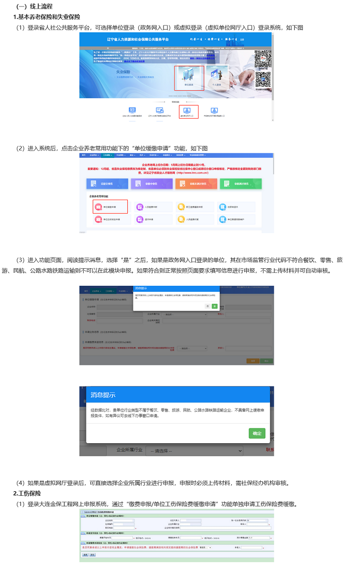 (1)登录大连金保工程网上申报系统,通过“缴费申报/单位工伤保险费缓缴申请”功能单独申请工伤保险费缓缴。