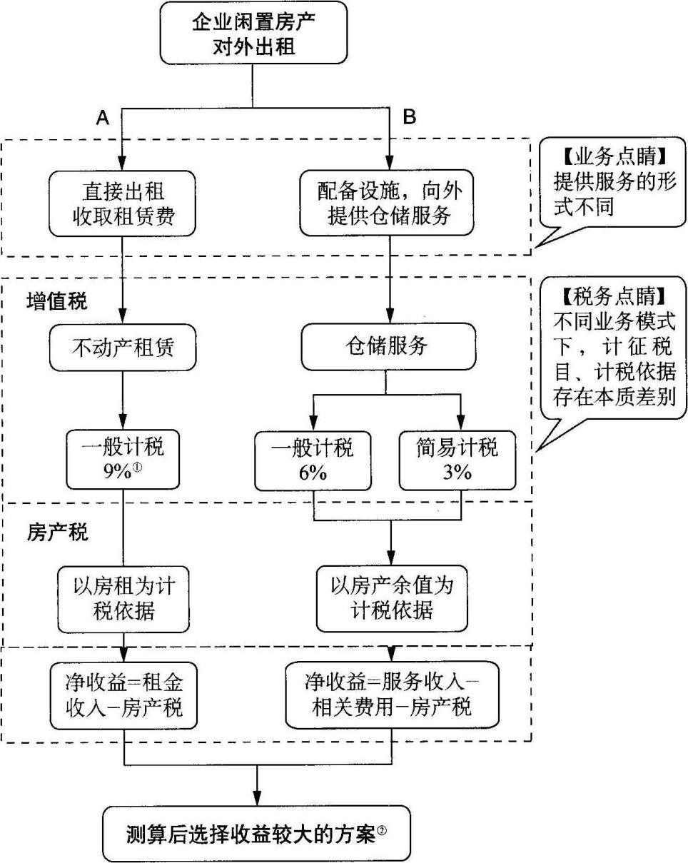 XX公司地处相对偏僻的郊区,拥有大量车间、厂房及库房,形成了一片工业园,账面价值2 000万元。由于园区周围目前配套设施不完善,暂时无法引进工业生产企业。于是公司负责人赵总召开了管理层会议,研究如何利用园区内空置的厂房来增加公司的收益。会上,业务部门提出,可以出租该厂房,也可以将厂房改为仓库,同时配备保管人员,为客户提供仓储服务。赵总觉得两种方案都可行,于是想让财务部王经理针对其中的税务事项发表意见建议。
